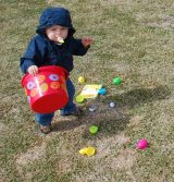 I had my first Easter Egg hunt this weekend. Mom noticed that just like my brother and sisters, I was happy and content to only pick up the first thing I laid eyes on. I also got to wear my first tie to church today and eat my first Eater Dinner. We went to Aunt Stacie and Uncle Rick’s house for a yummy ham and potato dinner. Mom gave my a spoonful of hot twice baked potatoes and my mouth got scorched, but I forgave her when she scooped a spoonful of raspberry pretzel salad in. Mom says that I am making some very creative noises these days. My most common sound is spitting with my tongue out. I get really excited when I play with toy cars, and think that pinwheels were a great invention. Oh, yeah – my sister’s have been pushing me in my swing, and Mason talked mom and dad into going on a bike ride yesterday. I have a lot of fun with my family.